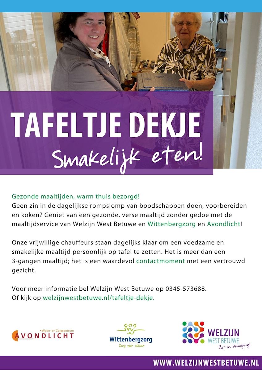 Maatschappelijk Werk West Betuwe biedt "Tafeltje Dekje" aan voor wie koken een niet meer vanzelf gaat.